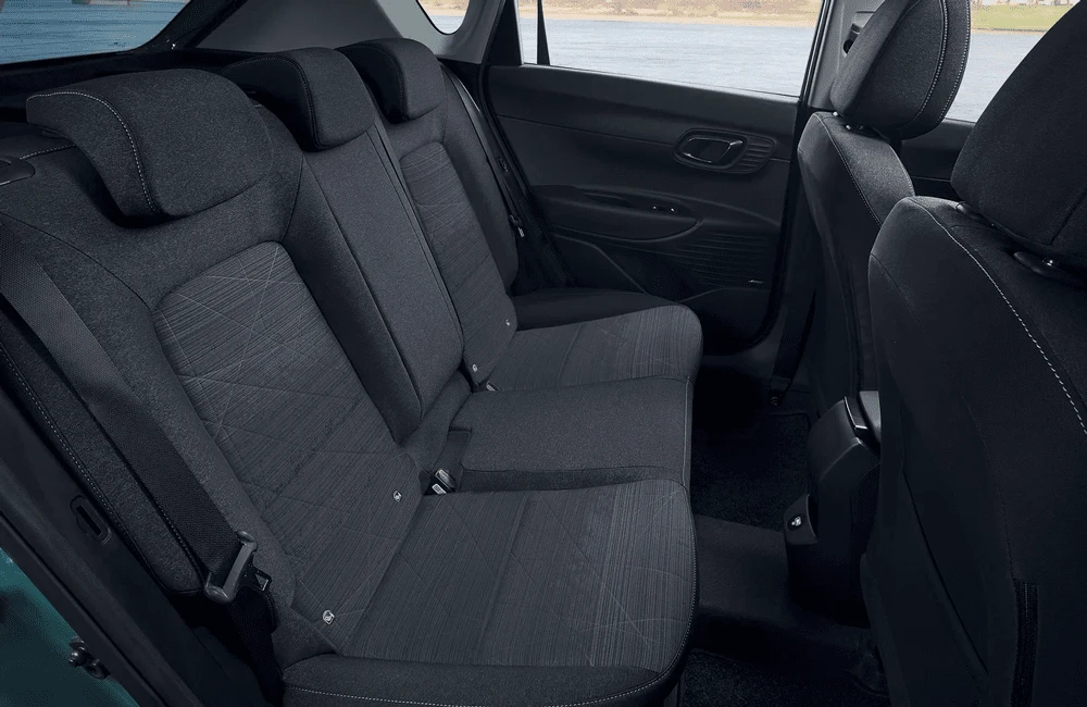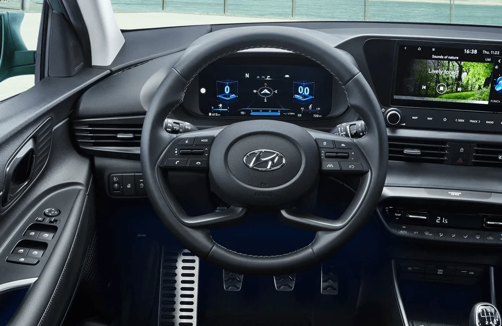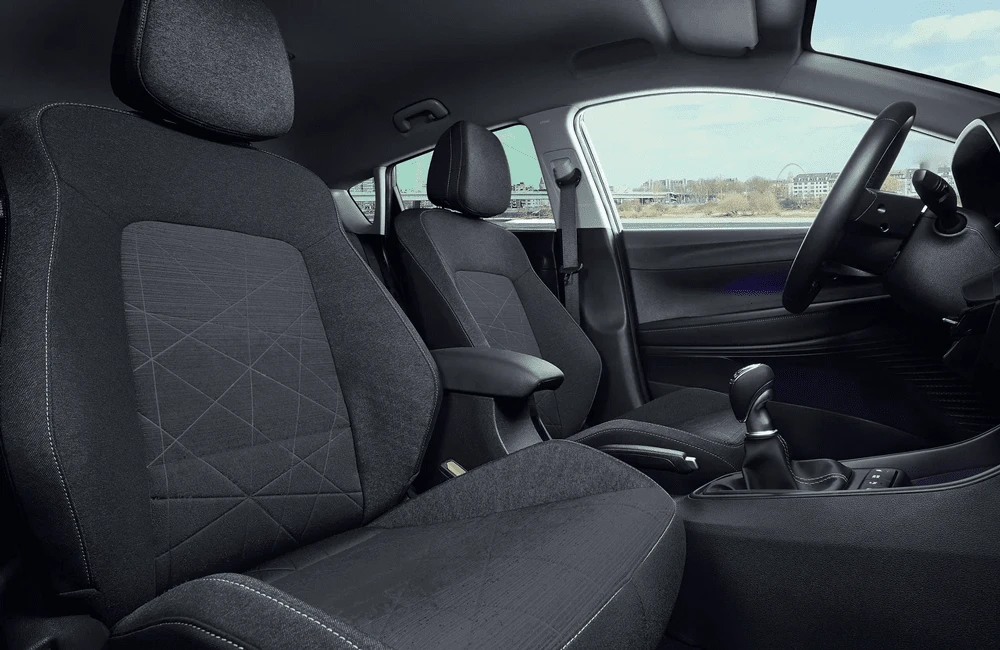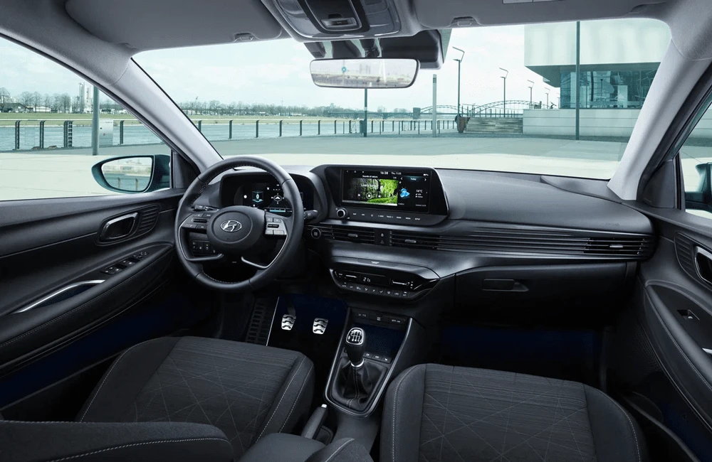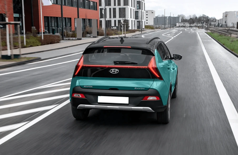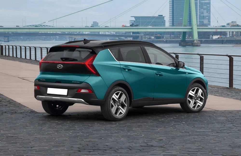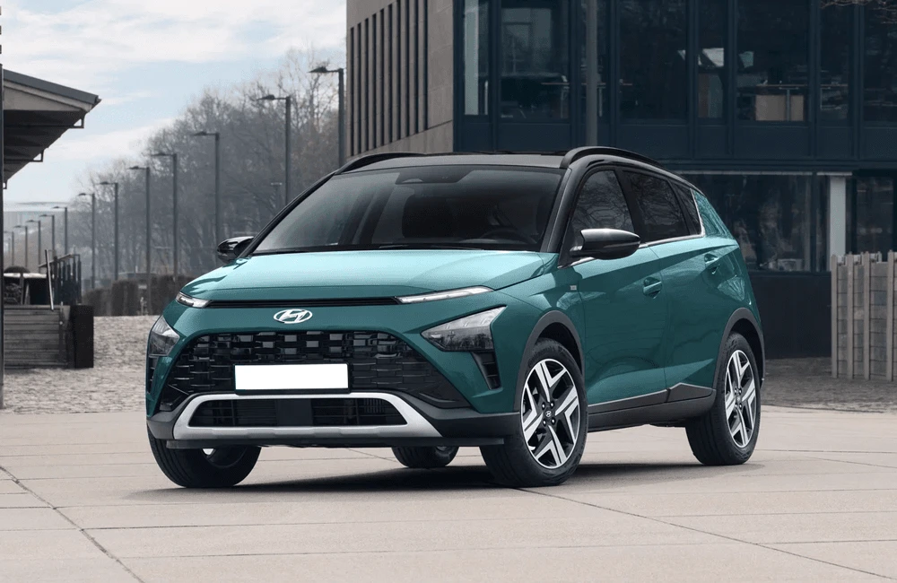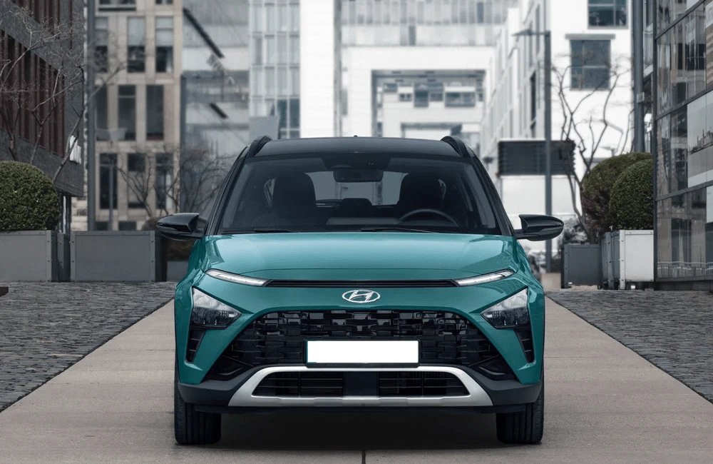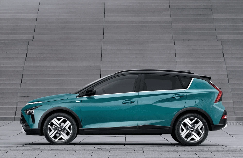 Hyundai Bayon — компактный городской кроссовер с выразительным европейским стилем. Экстерьер построен на сочетании четких линий и аэродинамичных форм, что подчеркивает современный характер модели. Передняя часть выделяется раздельной светотехникой и фирменной каскадной решёткой, а рельефные боковины придают кузову визуальную динамику. Задние фонари объединены световой перемычкой, усиливая эффект ширины и устойчивости на дороге.
